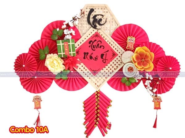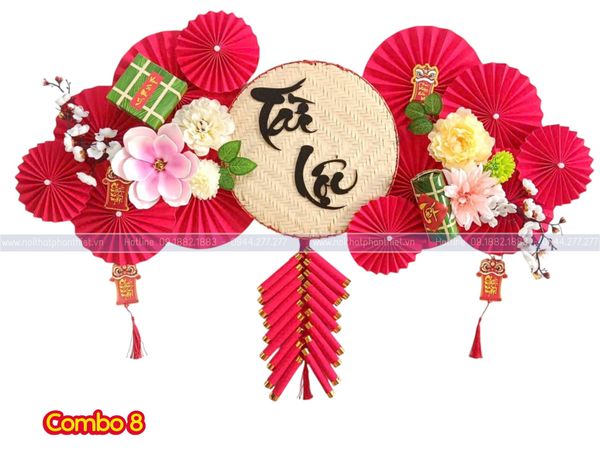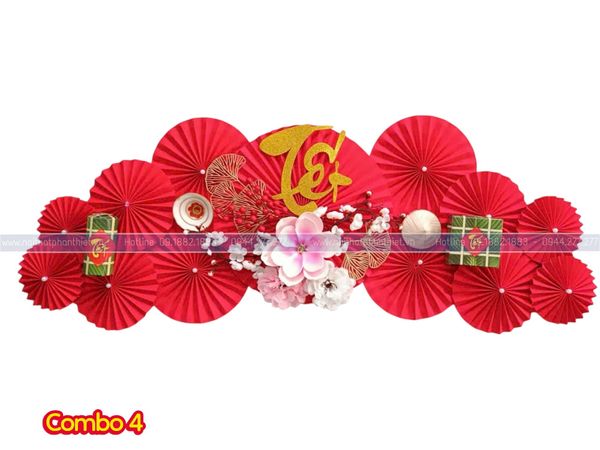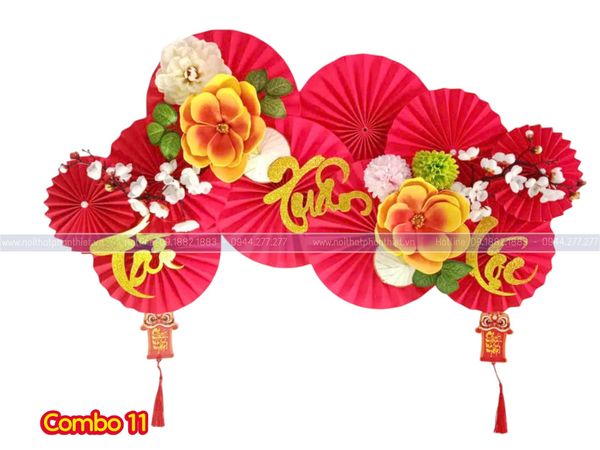 Combo Quạt Trang Trí Tết là mẫu decor nổi bật với tone đỏ – vàng may mắn, kết hợp quạt giấy nghệ thuật, hoa mai – hoa đào và chữ thư pháp Lộc – Tết sang trọng. Thiết kế theo dạng vòm trang trí, phù hợp treo ở tường phòng khách, cửa hàng, quầy thu ngân, backdrop chụp ảnh hay trang trí sự kiện.