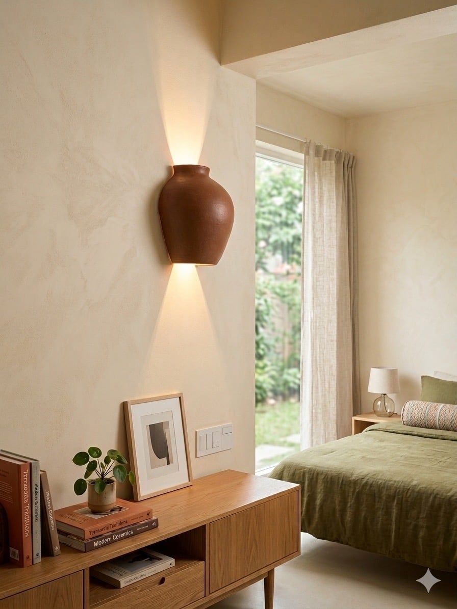 • Hiệu ứng ánh sáng tuyệt mỹ: Khác với đèn công nghiệp, đèn gốm mộc tạo ra luồng sáng dịu nhẹ, trung tính, không gây chói mắt. Ánh sáng len lỏi qua các kẽ gốm tạo nên những vệt bóng đổ nghệ thuật lên tường, mang lại cảm giác ấm cúng và thư giãn.