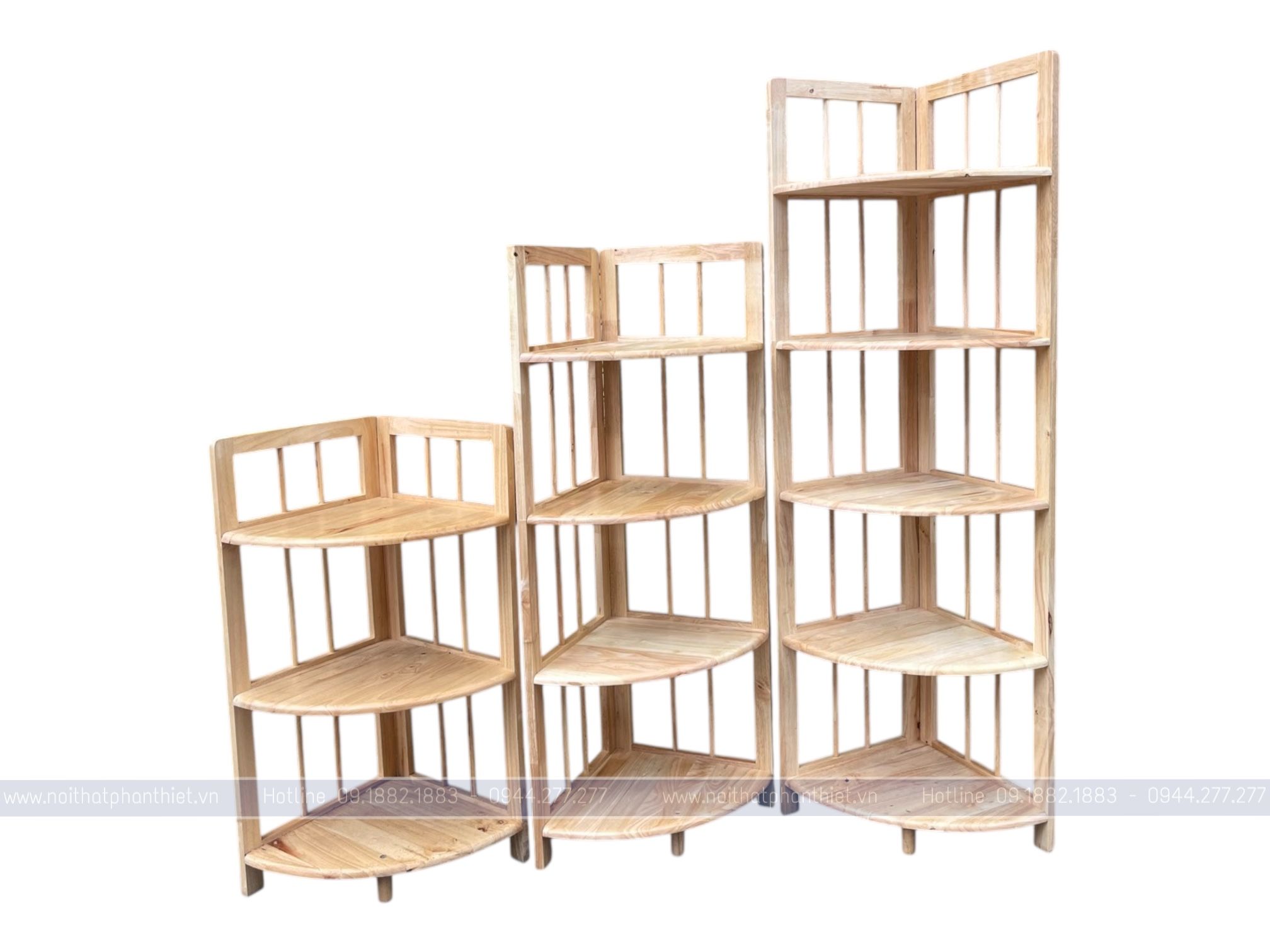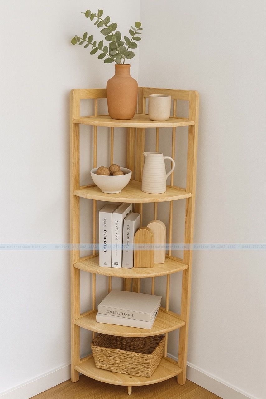Kệ sách góc 5 tầng làm từ gỗ cao su tự nhiên, thiết kế tam giác ôm sát góc tường giúp tiết kiệm diện tích. Kệ gồm 5 tầng rộng rãi, phù hợp để sách, chậu cây, đồ decor hoặc mỹ phẩm. Bề mặt gỗ mộc sang trọng, kết cấu chắc chắn, thích hợp cho phòng khách, phòng ngủ, phòng làm việc và cửa hàng trưng bày.