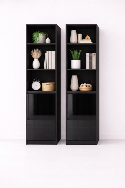 🔹 Chất liệu & hoàn thiện – Thùng kệ ván công nghiệp phủ melamine đen – Cánh tủ Acrylic bóng gương cao cấp, bề mặt phẳng mịn, dễ lau chùi – Kiểu dáng vuông vức, đường nét hiện đại, bền chắc